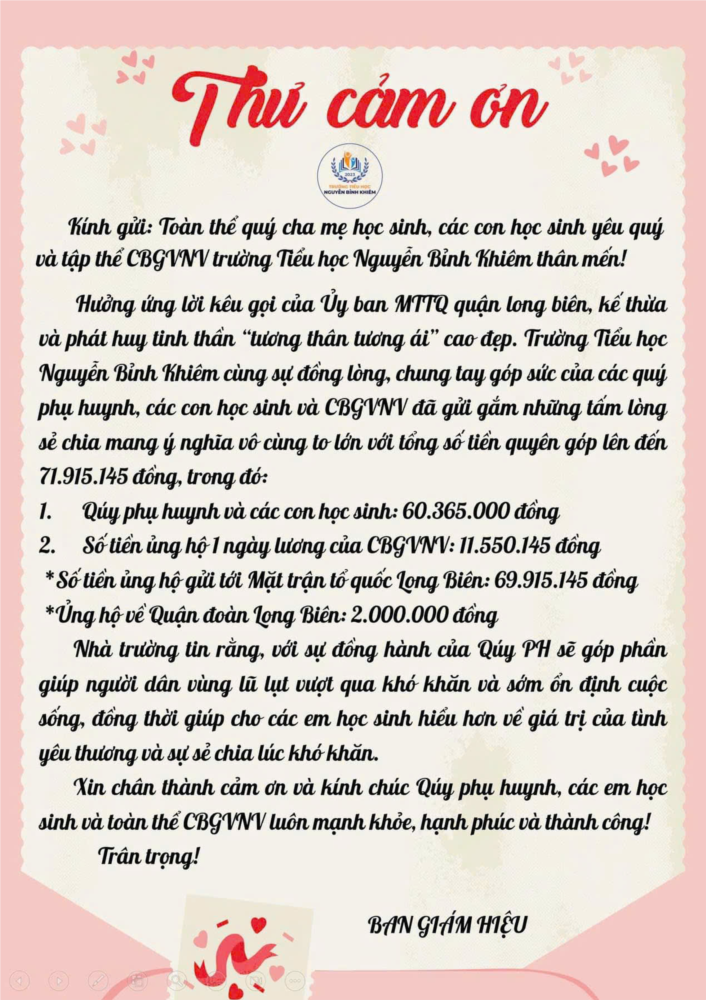 Trường Tiểu học Nguyễn Bỉnh Khiêm xin gửi lời cảm ơn chân thành đến quý phụ huynh, thầy cô và các em học sinh đã chung tay ủng hộ vì đồng bào miền Bắc trong cơn bão Yagi vừa qua. Số tiền đã được công khai tới PH từng lớp và được gửi tới Mặt trận Tổ quốc quận Long Biên và Quận đoàn Long Biên. Nhà trường mong rằng, sự sẻ chia của chúng ta sẽ góp phần mang lại sự hộ trợ nhỏ bé, kịp thời và tình cảm ấp áp dành cho đồng bào thân yêu!